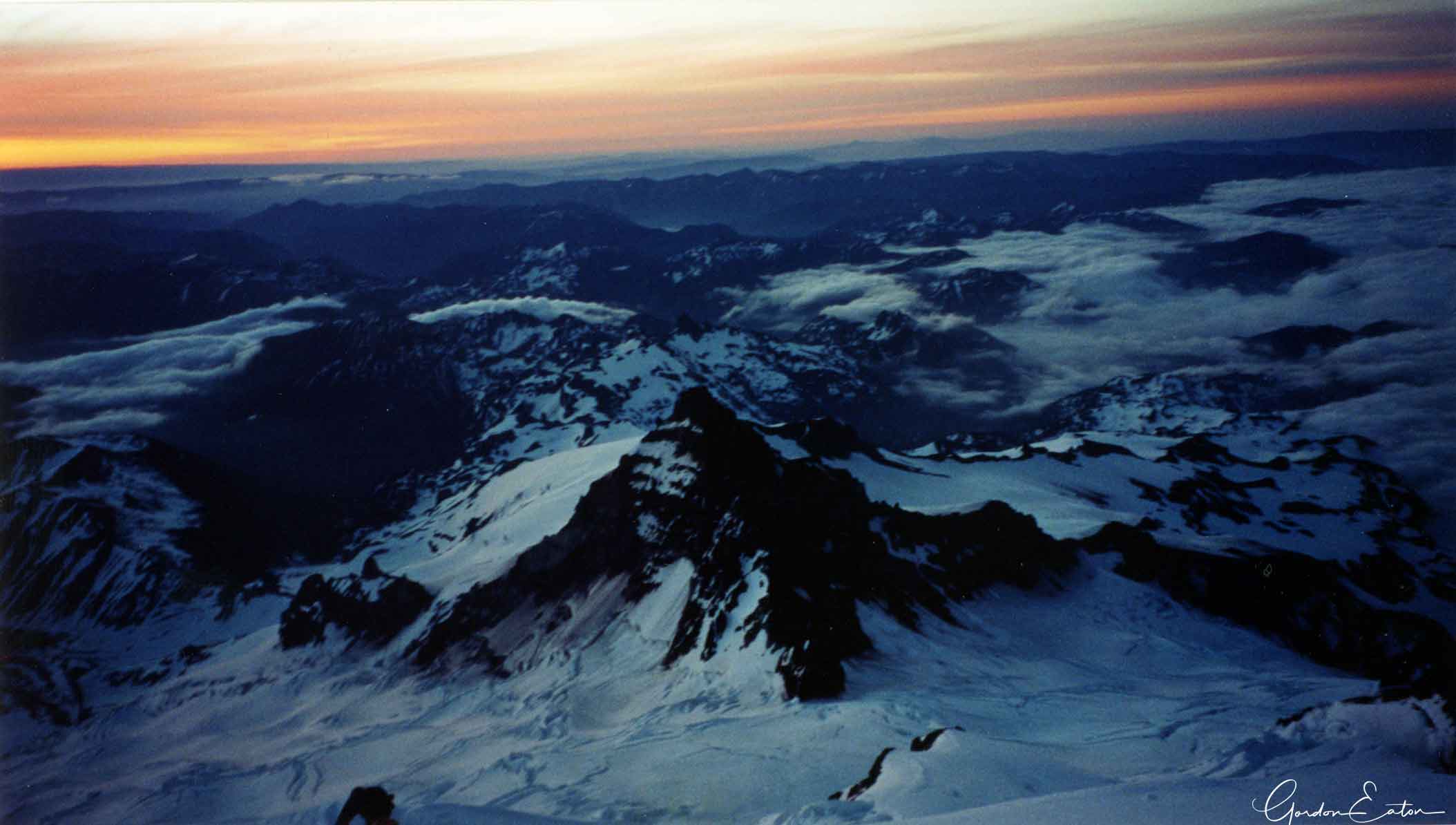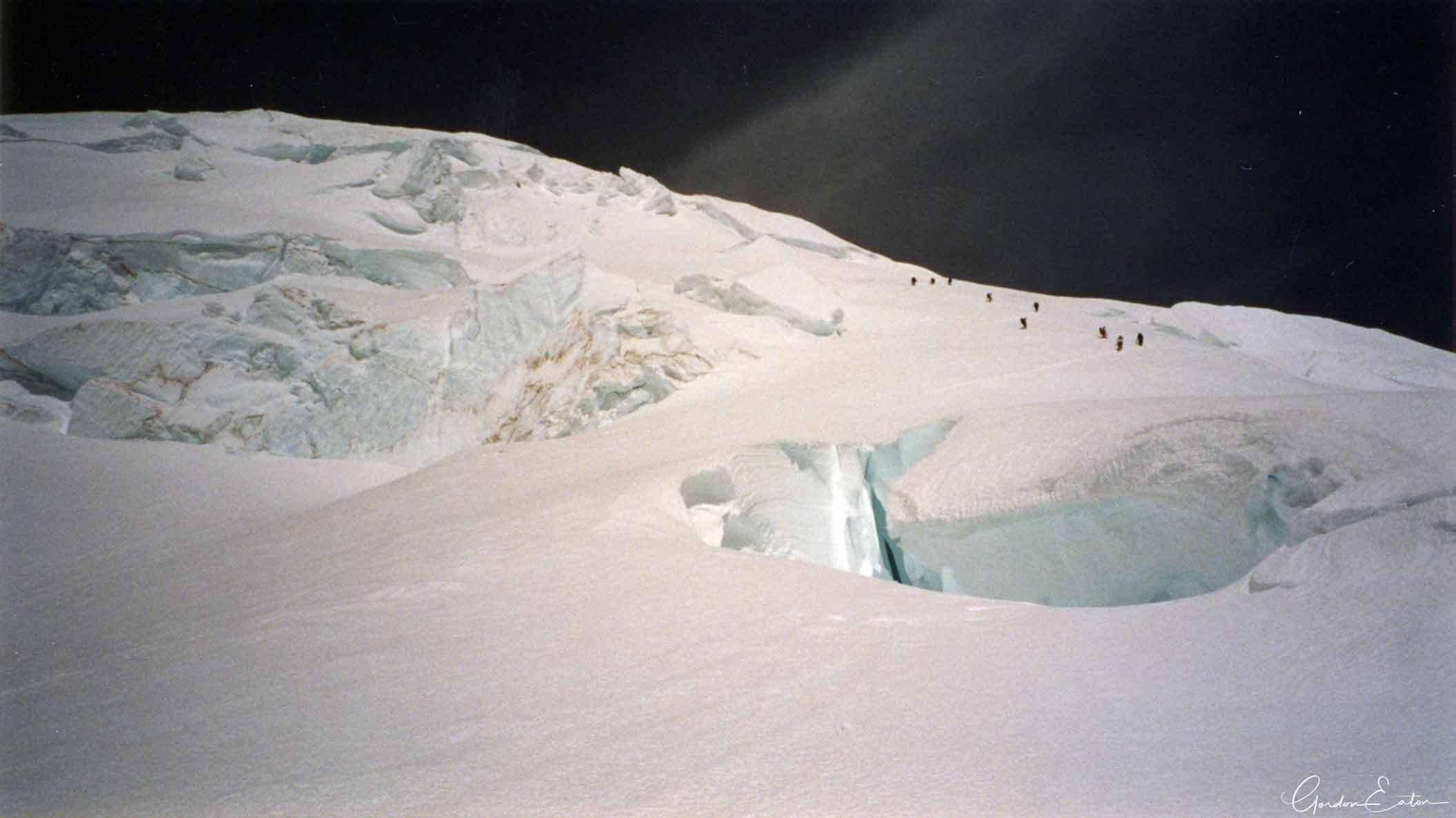 Our original plan was to climb Disappointment Cleaver, but it wasn’t viable. Instead, we chose the Ingraham Direct. About twenty minutes after passing through Cadaver Gap, we heard a deep rumble behind us—an avalanche. Later we learned it had swept through Cadaver Gap. Fortunately, no one was caught.