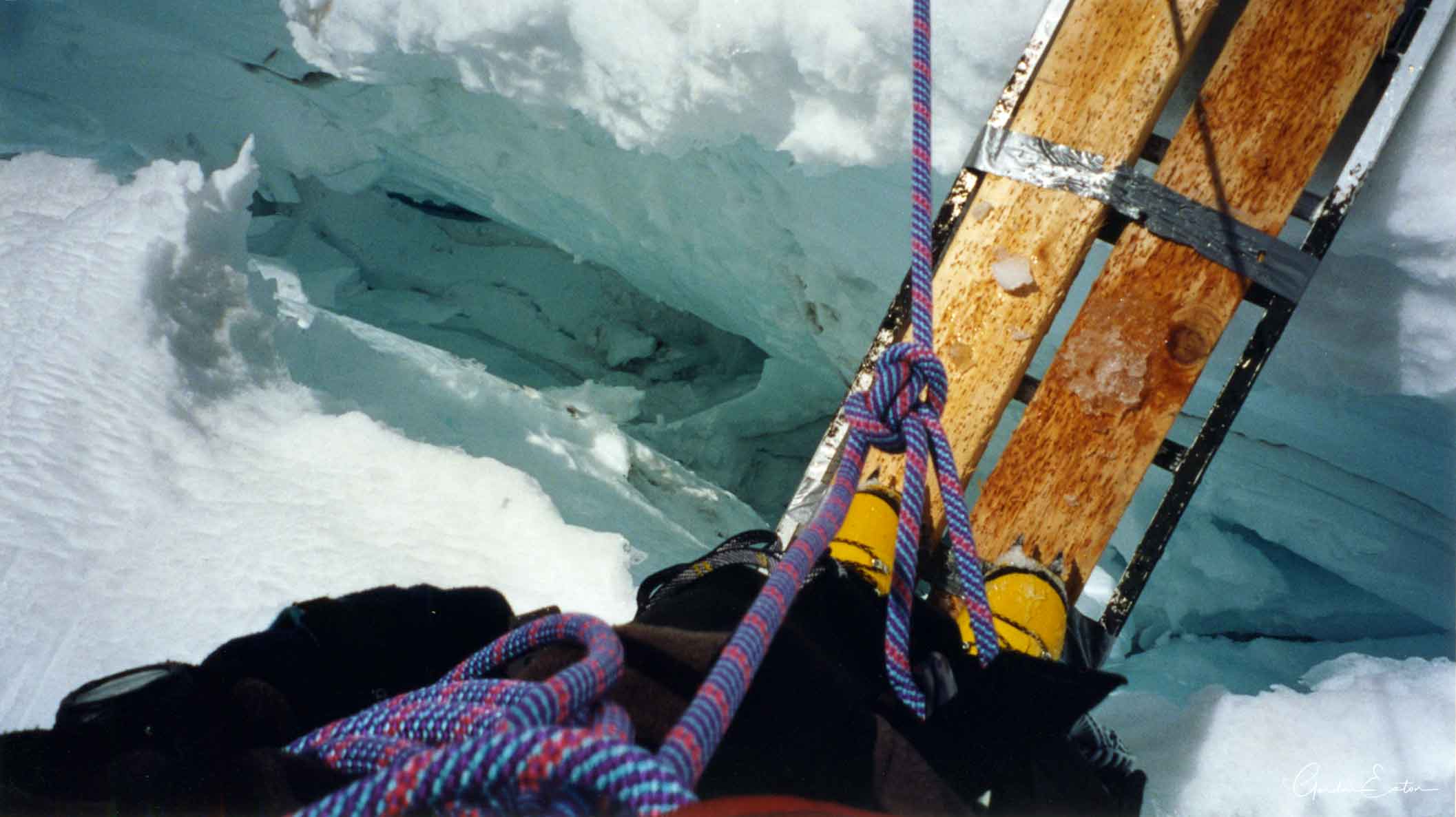 Later, we encountered a crevasse that had opened earlier that morning. Someone had placed a ladder across it. I paused to take a photo of my feet—it looked like something straight out of an Everest documentary.